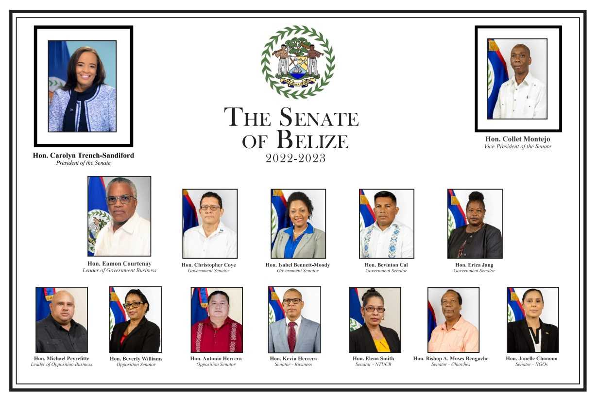 The Senate is currently comprised of thirteen appointed Members, while the President of the Senate is either elected from among the appointed Members or from outside of the Senate. The thirteen Senators are appointed by the Governor General; six Senators are appointed on the advice of the Prime Minister; three are appointed on the advice of the Leader of the Opposition; one is appointed on the advice of the Belize Chamber of Commerce and the Belize Business Bureau; one is appointed on the advice of the Belize Council of Churches and the Evangelical Association of Churches; one is appointed on the advice of the Belize National Trade Union Congress and the Civil Society Steering Committee; and one is appointed on the advice of the Non Governmental Organizations.